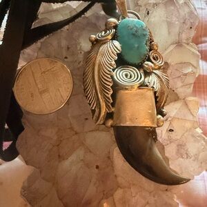 Elegant turquoise and silver pendant necklace featuring intricate leaf and swirl designs. Perfect for adding a touch of sophistication to any outfit. Native American made