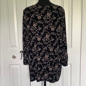 Stylish Beautiful Studio 1940 2X Black Top With Cream Floral Pattern With Strawberries and adorable little bows on the sleeves Ideal for versatile wear made in the U.S.A great Stretch 25 1/2 inches across chest laying flat from pit to pit 18 1/2 inches from pit to bottom hem of shirt about 11 inches from pit to end of sleeve smoke free home