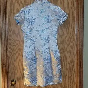 This elegant blue floral cheongsam dress is perfect for any special occasion. The intricate floral design adds a touch of sophistication and style. Measurements flat, bust 18", waist 16", hips 19".