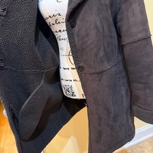 Faux suede and faux shearling means easy care. Can be washed or dry cleaned (see label), 2 pockets. Faux shearling covers all the interior for warmth. 31.5” long, XL.