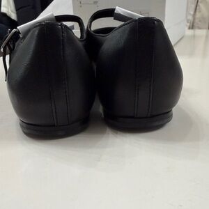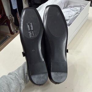 Sleek black leather flats with a stylish buckle. Versatile and chic.