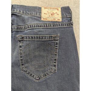 Details: Five-pocket design with distinctive True Religion stitched back pockets, zip fly with branded button closure, belt loops, contrast stitching, and stretch denim for comfort.