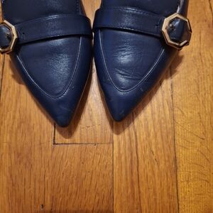 Elegant pointed toe navy blue leather flats with gold buckle detail. good condition