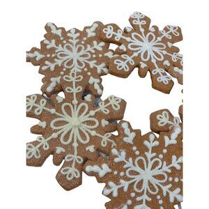 Enhance your holiday decor with this charming set of 6 gingerbread snowflake ornaments featuring intricate white icing designs and glitter accents.