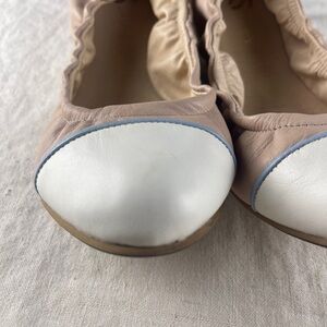 The Yosi Samra YS Pink, White, Blue Leather Ballet Flats in Women's Size 10 are stylish and comfortable flats perfect for everyday wear. The ballet style design with a leather upper adds a touch of elegance to any outfit. The vibrant pink color adds a pop of color to your ensemble, while the blue accents add a fun and trendy twist. These flats are a versatile and fashionable choice for any woman's wardrobe.