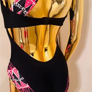 ASOS Swim Black and Pink One Piece Cut Out Detail One Shoulder Swimsuit, Size 6