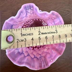 Beautiful quirky piece. Great condition. Small call out on the crease of a ruffled portion looks to be a discoloration in the glass (zoomed in on photo) No cracks or chips.