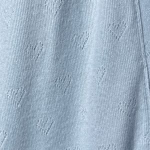 Fall in love with our long cardigan in baby blue adorned with heart-shaped pointelle knit. This romantic piece features a button front closure, along with side slits at the hem for enhanced comfort and style. Super soft fabric
