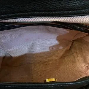 Sophisticated black leather tote. Features gold-tone hardware and sturdy handles. EUC