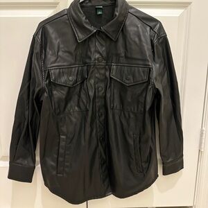 Stylish black faux leather shirt jacket. Features button closure and chest pockets. Ideal for layering. Runs big.