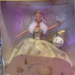 Barbie Y2K collectors doll in a sparkling gold gown with a white fur stole. Features a gold crown and festive ornament with 2000 on it.