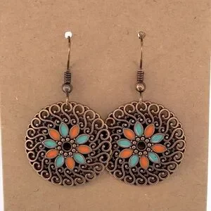 Add a vintage touch to your ensemble with these exquisite floral bronze earrings. Featuring vibrant turquoise and orange accents, they are perfect for any occasion.