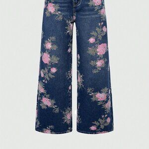 Blue Casual Women's Floral Print Washed Loose Baggy Flared Jeans