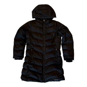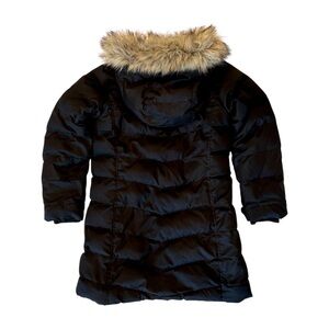 This Lands’ End fleece-lined girls parka is the perfect blend of warmth, durability, and winter-ready comfort. Designed with a chevron quilted, water-resistant shell in a solid black slightly sheen color, it hits just above the knee for extra coverage on cold days. Soft plush fleece lining (including the sleeves!) keeps her cozy all season long, while the hood’s soft faux fur brown gray trim adds both warmth and a cute, classic winter look. It feels lightweight but insulates beautifully thanks to Primaloft fill, making it ideal for everyday school wear, outdoor play, and winter trips.
