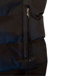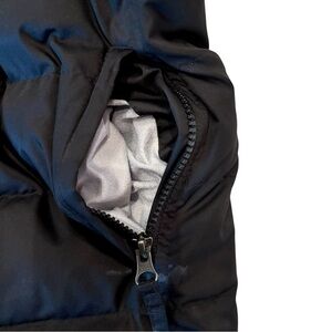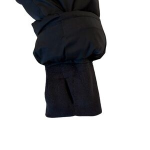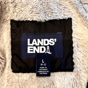 Warm and durable Lands’ End fleece-lined parka in solid black. Plush gray fleece inside, water-resistant shell, SnowGuard cuff, removable faux brown gray fur hood, and fleece pockets. Lightweight but very warm thanks to Primaloft. Excellent pre-owned condition with minimal wear. Small stains at left pocket and sleeve. See pics. Large 10/12.