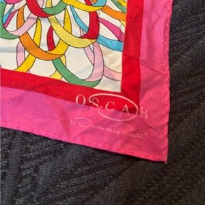 Beautiful Oscar by Oscar de la Renta pure silk square scarf featuring a vibrant ribbon-loop floral print in bold pinks, yellows, greens, and blues. Finished with a bright pink rolled hem. Perfect as a hair scarf, neck scarf, bag accessory, or styling piece.