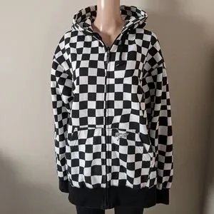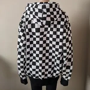 Stay stylish and comfortable with this checkered black and white hoodie. Perfect for casual outings and cozy days. In good condition, men's L.