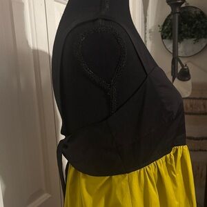 Elegant midi dress featuring a bold colorblock design. Includes black, yellow, purple, and pink sections. Accentuated with a stylish bow.