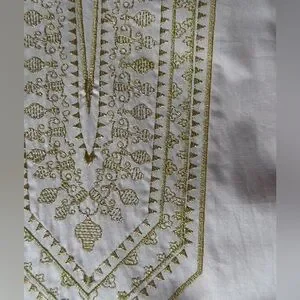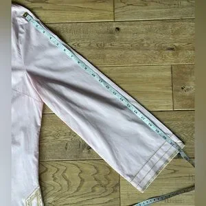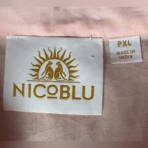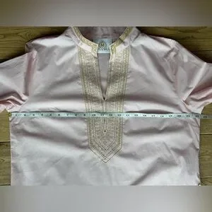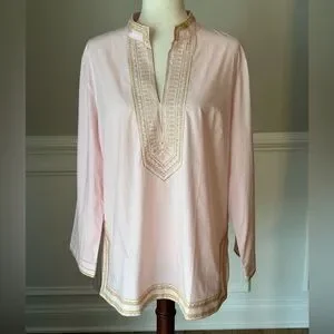 Maharani Tunic from Nicoblu. Size Petite XL. Blush Pink Embroidered in Gold Filigree. Approximately 22.5” pit to pit; 28.5” long; 22” sleeve length. Very good used condition; all it needs is a good steam/iron!