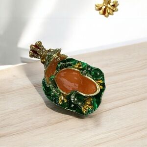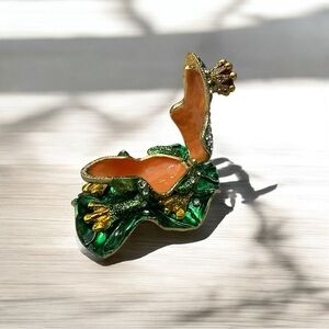Charming frog prince trinket holder with jeweled details. Features vibrant green, gold, and red accents. Store your rings, necklace, earrings or other small items.