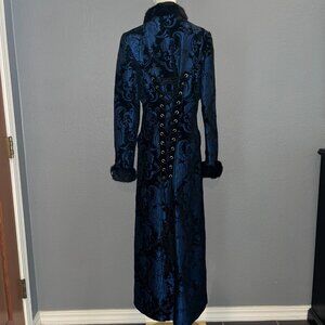 FROM THE SHRINE WEBSITE: : Winter is coming! Out of the mists of medieval Europe..... Across oceans of time... A beautiful luxurious full-length coat made in rich blue on black woven tapestry fabric. Lined at the collar, cuffs and down the front in soft faux fur. The inside is fully lined with sleek black satin. Fastens in front with two hook and eyes on the inside and has three ornate decorative buttons on either side. Black metal zips at each cuff for a more comfortable fit. Grommets and heavy rope cinches up the back make for a flattering form fit. A work of art!