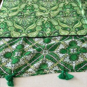 Elegant green kimono with intricate patterns in green white and black. Lightweight and stylish. Perfect for layering with a blouse & pair of slacks for the office or with a t-shirt and a pair of jeans for a more casual vibe.