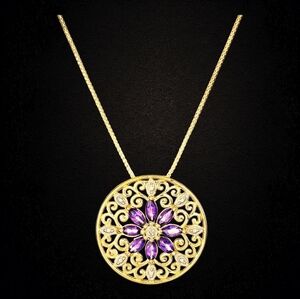 Style Tags: amethyst, birthstone, February, filigree, mandala, diamond accent, gold plated, gemstone necklace, giftable, elegant