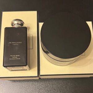Elegant Jo Malone collection with Velvet Rose & Oud cologne and body creme. Sophisticated black and cream packaging.