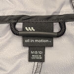 All in Motion Windbreaker Jacket Hooded Black Gray Camo Camouflage size 8/10. Black and gray camo. Full zip front with pockets, attached hood and thumbhole slits on the sleeves. New with tags, in new condition.
