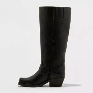 NEW Boots - Made from faux leather, these black boots are designed with a square closed toe and a knee-high silhouette, elevated by a harness strap accented with a silver-tone ring and nail heads for stylish moto flair. They sport a side zipper closure for a smooth fit and boast a memory foam insole for all-day comfort, and the 1.5-inch block heel adds a statement lift to your height.