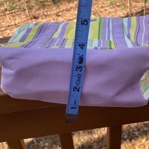 Small striped pastel bad. Top closes with a snap. Front has small slip pocket. Slight rusting around rivets in handle, pictured. Pet and smoke free home.