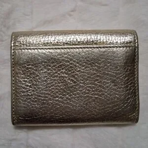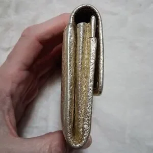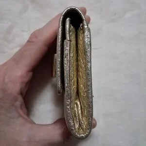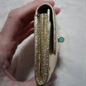 Gold metallic with Tiffany Blue inside and inside outer pockets. two outer pockets, two inner and one center wide spot.