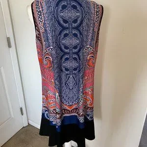 MSK sleeveless tunic dress in size Large. Features a beautiful paisley/medallion print in navy blue with coral and rust accents. Scoop neckline with black trim. Lightweight and comfortable—perfect for work, casual wear, or travel.