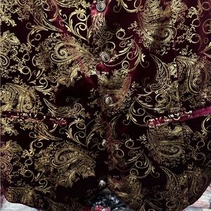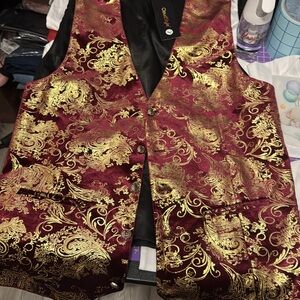 Stylish vest featuring a rich burgundy and gold paisley design. Ideal for formal events.