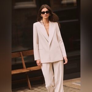 From Website: EMBRACE A MODERN SUITING AGENDA WITH THE MAYA BLAZER IN NEUTRAL. IT’S TAILORED INTO A SLEEK, SINGLE-BREASTED SHAPE WITH PEAK LAPELS. CONTRARY TO A TRADITIONAL WORKWEAR SILHOUETTE, IT DOESN’T FASTEN AT THE FRONT, RESULTING IN A MORE LAID-BACK LOOK. STREAMLINE YOUR EDIT BY PAIRING WITH THE COORDINATING TROUSERS AND CHOOSING TONAL HEELS.