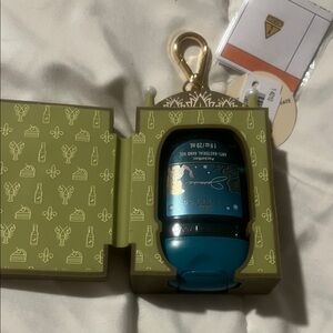 Charming Tiana's Place keychain pocket vac with a brown and green design. Features a gold clip for easy attachment. Lights up. Sanitizer included
