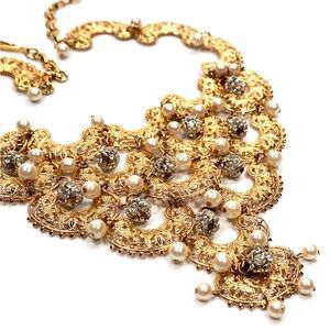 This stunning vintage Vendome gold collar necklace features intricate designs and elegant pearl accents, perfect for adding a touch of sophistication to any outfit. From the 1949s to 1950s. Size adjustable.