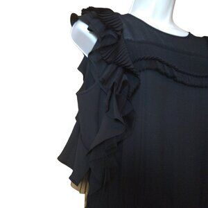 BCBGMAXAZRIA women's size 6 black sleeveless romper is made of 100% polyester. It has ruffle detailing on the shoulders and on the chest. It has partial zip closure in back on the shorts part and the back is more sheer and has snap and button with loop closure at the neckline.