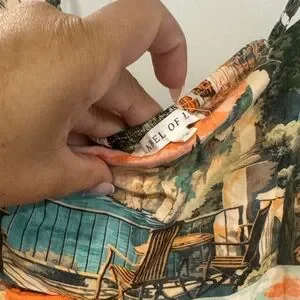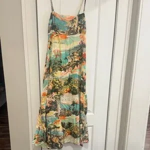 Vibrant tropical print maxi dress with spaghetti straps. Perfect for summer outings.