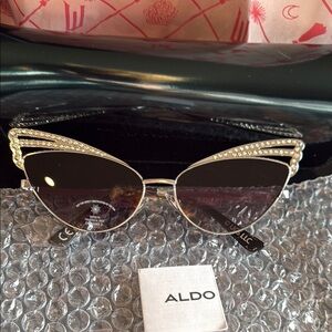 Chic cat-eye sunglasses by Aldo. Elegant black frames. Stylish gold accents on the sides. Perfect for any occasion.