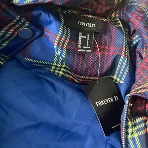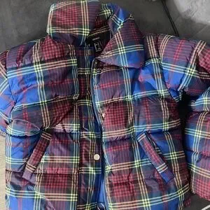 Vibrant plaid jacket with blue and red tones. Ideal for a bold fashion statement.