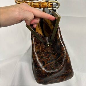 This elegant vintage inspired handbag features a rich brown leather design with a unique bamboo handle, perfect for adding a touch of sophistication to any outfit.