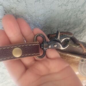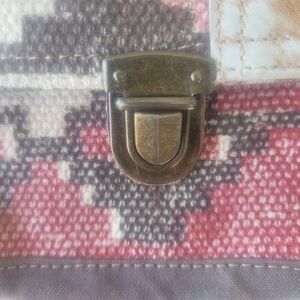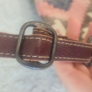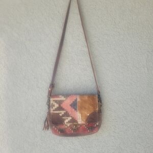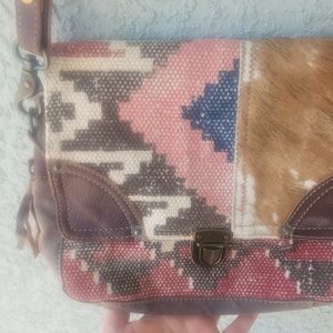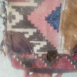 This is a Myra Bag Upcycled Canvas Flap and Hair-On Leather Crossbody Bag Purse.