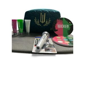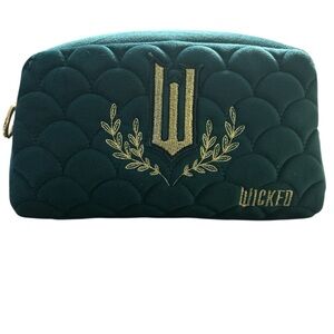 Stylish green Wicked quilted makeup bag with gold embroidery. Includes a vibrant Wicked eyeshadow palette and assorted beauty products.