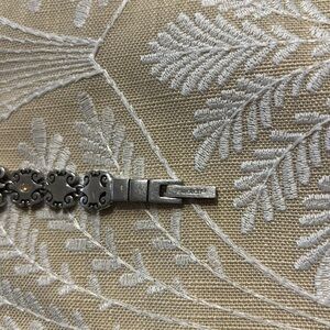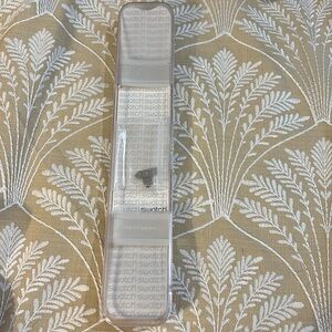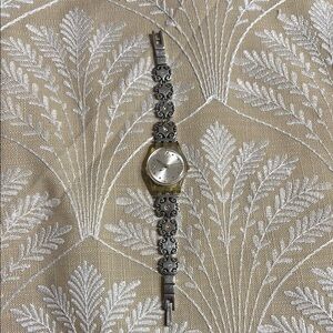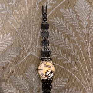 Elegant Swatch watch with a silver and gold design. Small amber colored beads on wristband. Features intricate detailing on the band. Perfect for any occasion. Used condition, needs a fresh battery. Comes with original box, certificate of purchase, and extra links and pins.