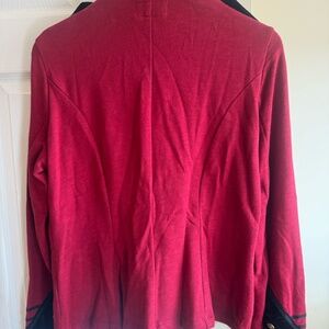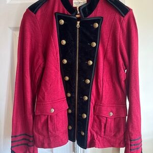 Stunning and rare Denim & Supply by Ralph Lauren military-inspired jacket. Features a bold red body with black velvet trim, gold crest buttons, epaulette shoulders, and a full zip front. Structured style with a vintage military/band jacket vibe — perfect for fall, concerts, costumes, or statement outfits.