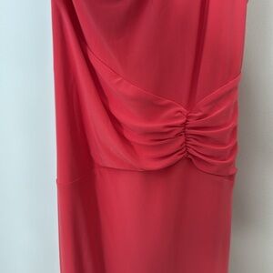 Color is pink, very stretchy, ruched mid section! One shoulder and a slit