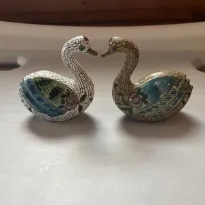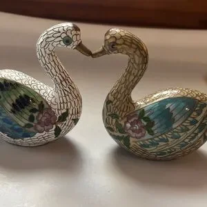 Pair of elegant cloisonné swan figurines. Features intricate floral designs in blue, green, and purple. Swans mate for life so these two stay together ❤️😊