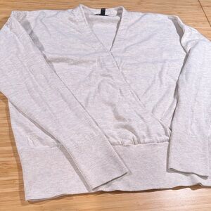 Simple cream beige sweater with a drop shoulder design and wrap yet oversized look. Grey under tones, great for work.