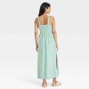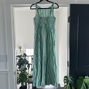 Stylish green and white striped maxi dress. Sleeveless design. Perfect for casual outings.